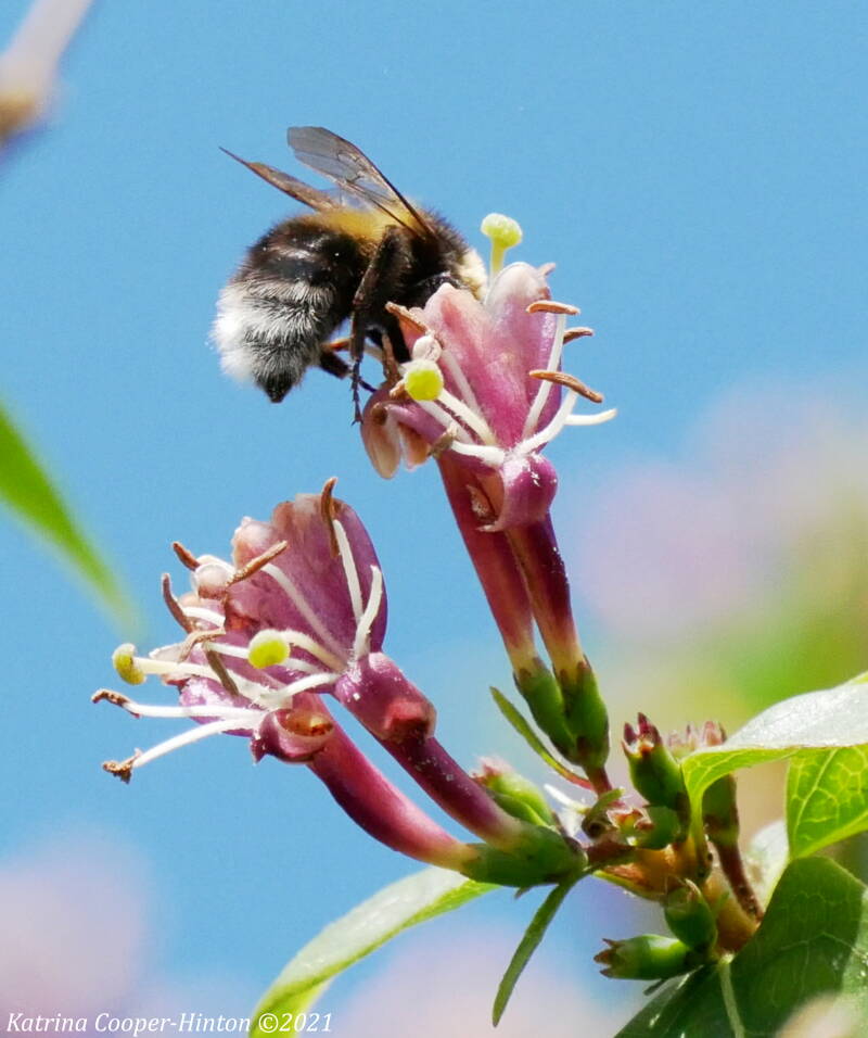 Tree bumblebees often prefer habitats scorned by other bees, making them a particularly important pollinator as they "take up the slack" in a lot of areas. They regularly nest close to human habitations, founding colonies in hollow above-ground spaces such as disused bird boxes. In clement times they normally produce two colony cycles in a year, and Queens have been known to usurp existing colonies by killing the reigning Queen. They're quick and busy little bumblebees, less defensive/aggressive than many of the other types, and in my garden they're most attracted to the honeysuckle. Their colonies can reach between 150 and 400 workers.
