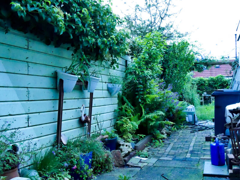 I moved, 13+ years ago, into a Dutch single-family home with an unusually large garden for the area: it’s about 10 x 4 meters, a strip off the back of my house with an alleyway behind that used to be backed by a nearly-hundred-year-old juniper grove that someone deemed fit to slash out three years ago, leaving a pit of mud and stumps, scattering rare amphibians and a huge murmuring of starlings to the city’s foul winds and changing my view from peaceful singing mini-forest to just the back of some boring dilapidated row-house and the street on the other side. When I moved in here, the garden was a plain of graveled concrete tiles edged with some mostly non-native shrubberies. This would not do.