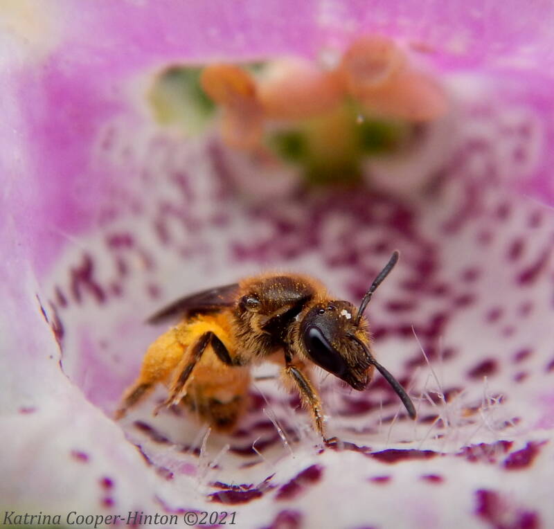 Extremely common in my garden, these curious and engaging little bees will boldly try to drive even the largest bumblebees off of flowers they wish to make use of. They're very fast and hard to photograph. Nesting in dried twigs and other