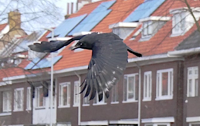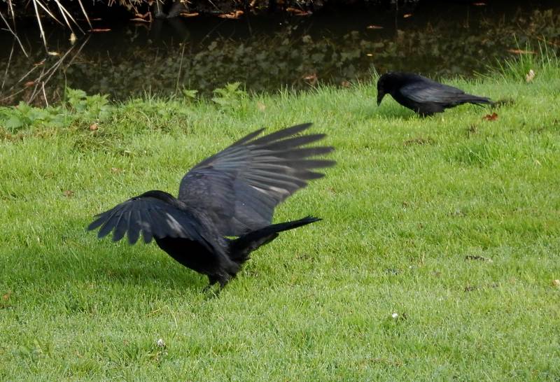 discovered that we both thought, independently (paraphrased), "Oh look, a bird, no, never mind, it's a trash bag blowing in the wind." Then it raised a very obvious wing and we both said out loud (paraphrased), "Holy crap, that's a crow!"
