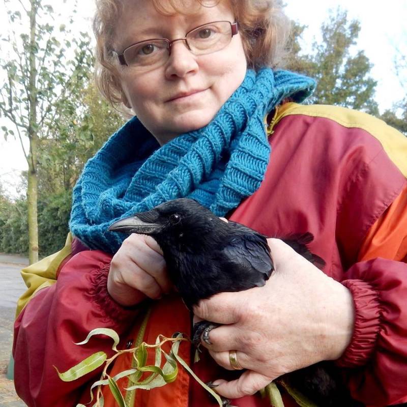 We rushed over there and indeed, it was (as you can see) a young crow. This was October, so he (we know now; thought at the time it was a female) must have been about a year and a half old, so around half a year away from his parents. Judging from how the whole scene looked, it was my assessment that he had succumbed to a very common accident among young birds, and panicked when a car/truck/bus went past him, flying right into the side of a moving vehicle. I couldn't really assess whether he'd make any kind of a recovery or not so I picked him up carefully, supporting his neck, and nestled him into my arms. We talked about it for a second and decided to go home and, if he'd made it that far, call the Animal Ambulance to have him taken to the bird hospital.